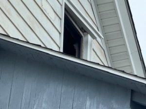 Then I spotted it. One our neighbors’ attic windows blew out and somehow flew sideways to land in our lawn. Weird. It had to have flown like a Frisbee to end up where it did.